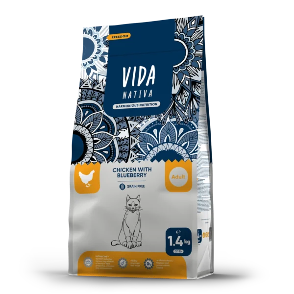 Vida Nativa Chicken & Blueberry is a premium natural cat food with chicken and blueberry. Chicken and blueberries make a delicious and healthy combination. This mix is a great source of protein, essential for strong bones and healthy joints, while superfoods like blueberries also provide fiber and antioxidants, which help strengthen the immune system.