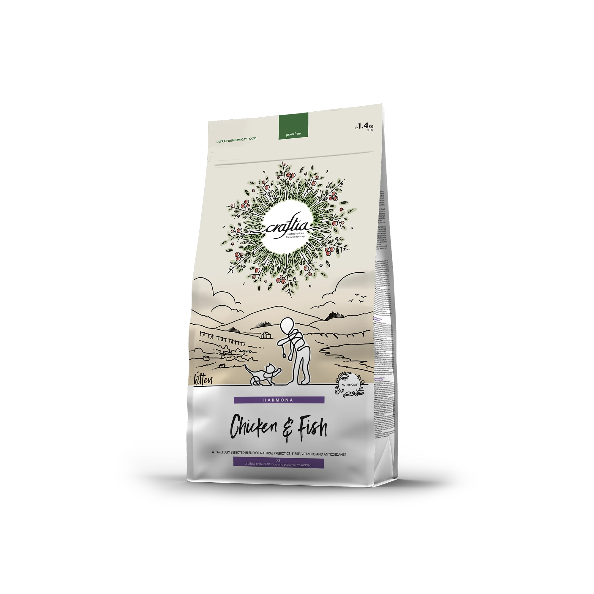 Composition: raw chicken (20%), pea starch, dehydrated chicken protein (11%), dehydrated herring protein (11%), herring (8%), salmon (8%), chicken fat, fish oil (from salmon), quinoa seed extracted (4%), hydrolyzed fish proteins, hydrolyzed poultry proteins, chicken giblets (liver, heart, kidney), dried eggs, linseed, dried beet pulp, alfalfa meal, pea fibre, dried blueberry (0.5%), chicory inulin (0.4%), yeast extract (source of manno-oligo-saccharides) (0.3%), fructo-oligosaccharides (0.3%), dried cranberry, dried cherry, dried apple, dried asparagus, dried pumpkin, Ascophyllum Nodosum, calcium carbonate, monocalcium phosphate, potassium chloride, sodium chloride, dried brewers’ yeast, rosemary, turmeric, marigold, psyllium husks and seeds, Yucca schidigera.
