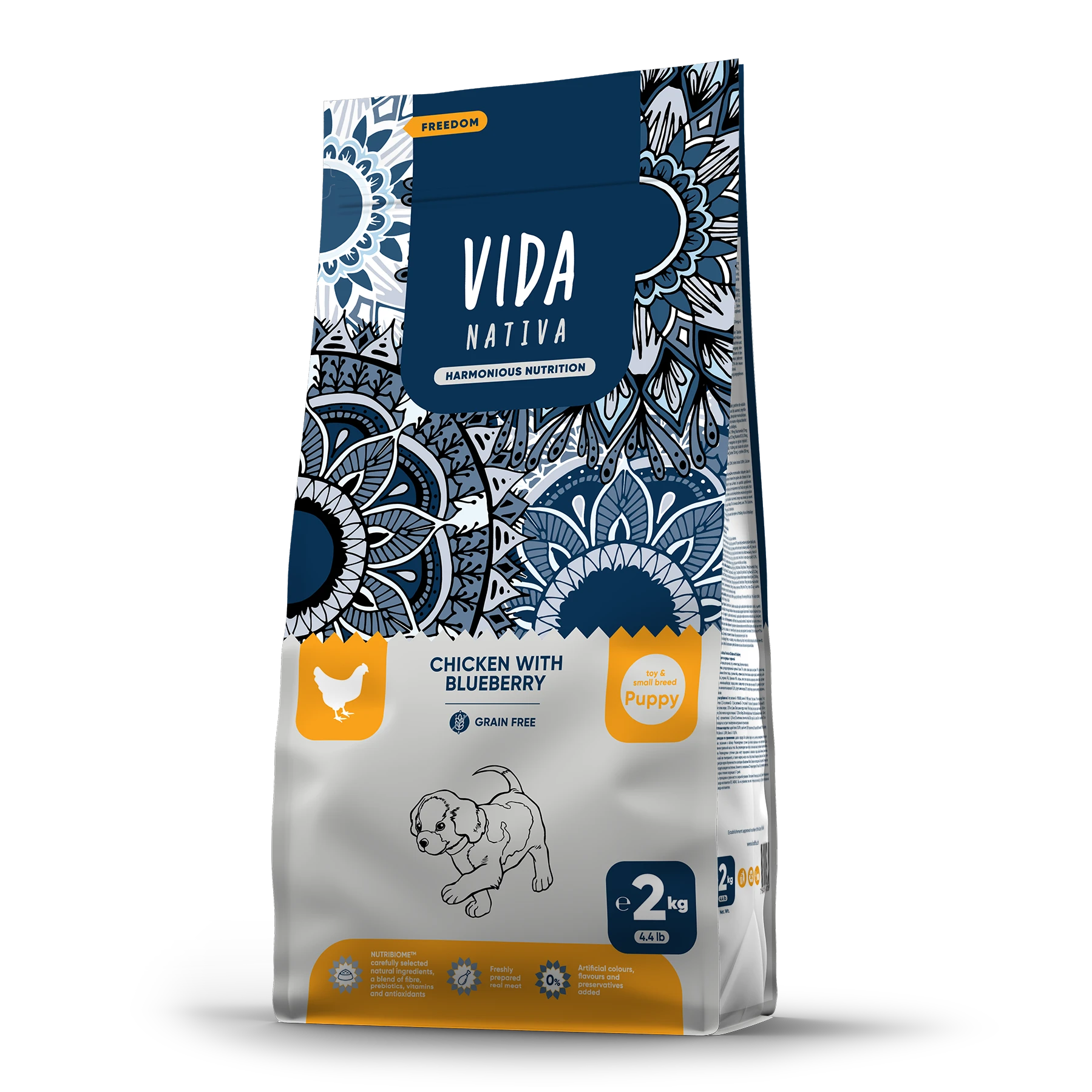 Composition: dehydrated chicken protein (21%), potatoes, pea starch, raw chicken (11%), chicken fat, hydrolyzed poultry proteins, dried eggs, chicken cartilage (source of glucosamine and chondroitin sulfate), linseed, fish oil (from salmon), blueberry (4%), broccoli (4%), asparagus, spinach, dried beet pulp, alfalfa meal, pea fibre, calcium carbonate, monocalcium phosphate, potassium chloride, sodium chloride, dried brewers’ yeast, chicory inulin (0.4%), yeast extract (source of manno-oligo-saccharides) (0.2%), fructo-oligosaccharides (0.2%), Ascophyllum Nodosum, dried mint, marigold, psyllium husks and seeds, Yucca schidigera.
